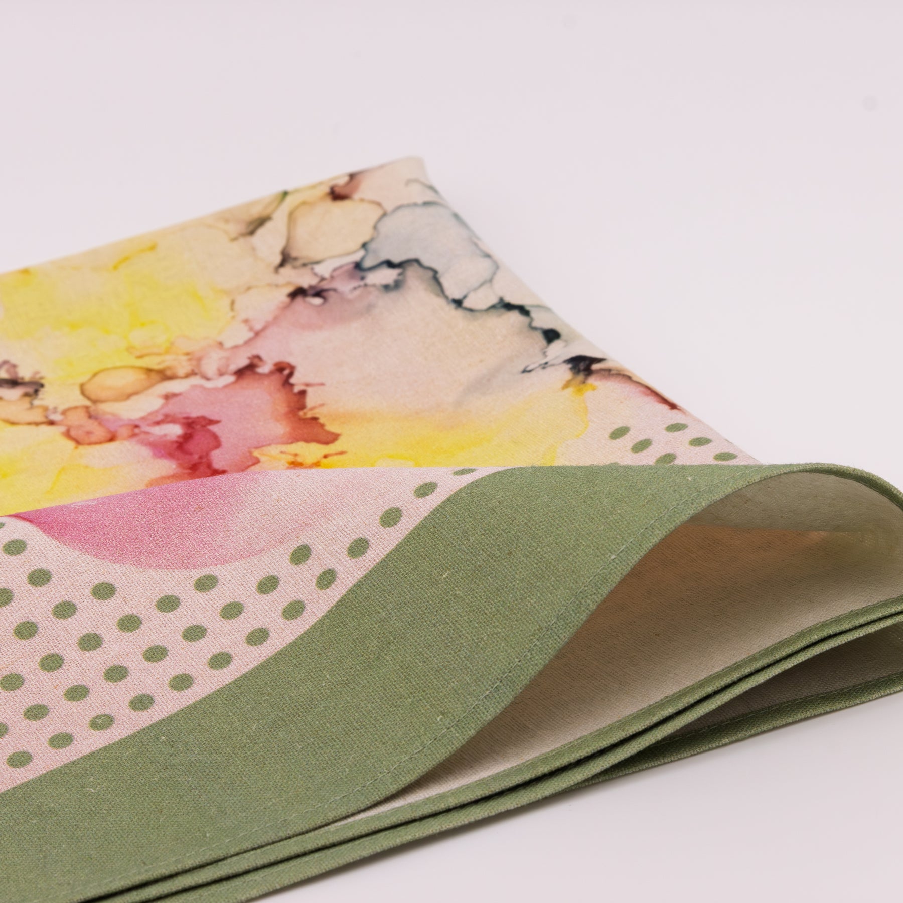 プリントが曲がることがあります。(斜行度3〜5%)これは生地の製作過程で生じるやむを得ない現象ですので、予めご了承ください。生地が少し曲がっている場合、曲がっている方向と反対に力を加えて引っ張ることで緩和できます。
